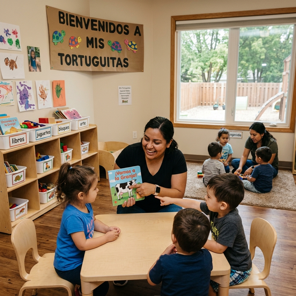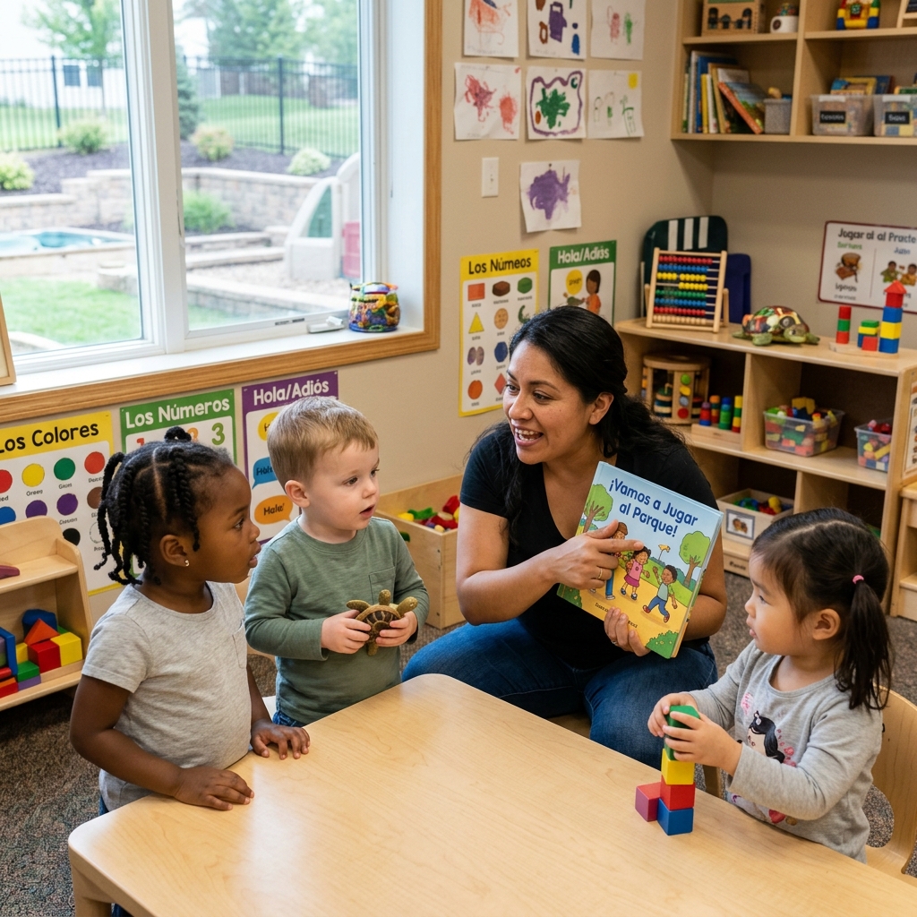 A typical frustration: you enroll at a larger center, and your child’s classroom teacher changes every few months. You fill out a form noting your family speaks Spanish at home or wants bilingual exposure, and you’re told they “incorporate” Spanish time a few afternoons per week. Your child comes home with English-only worksheets and classroom newsletters.